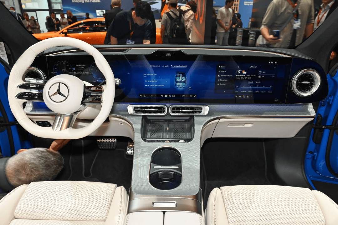 内饰的样式目前暂未曝光,但个人预计应该会和全新GLC EV五座版保持相同的设计,配备39.1英寸MBUX超联屏以及智能光感全景天幕。