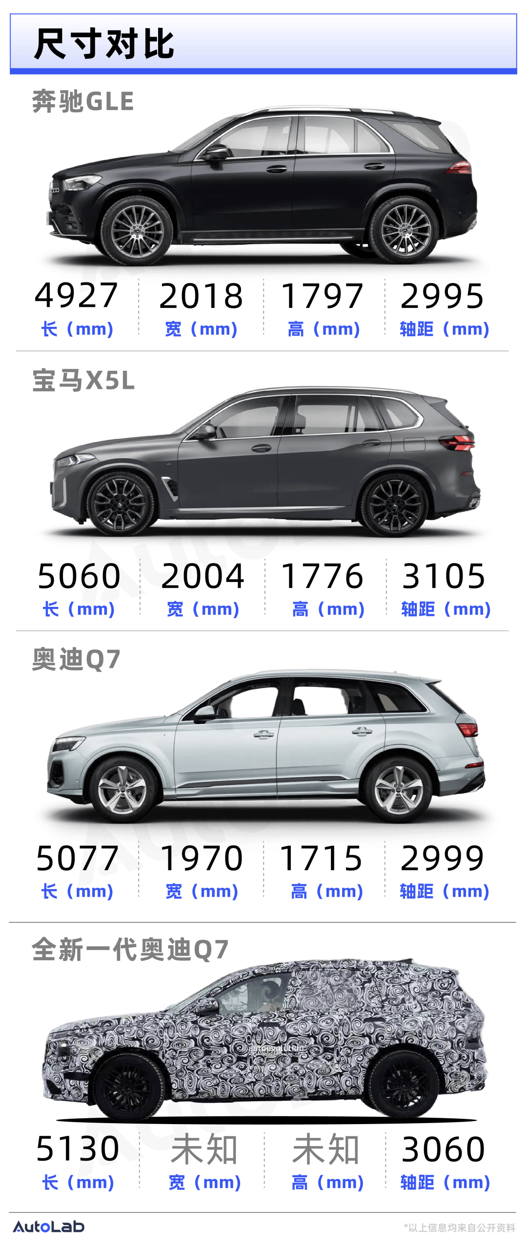 明年全新Q7将会与GLE一样,选择加长。预计车长会增加到5130mm,轴距也将达到3060mm。