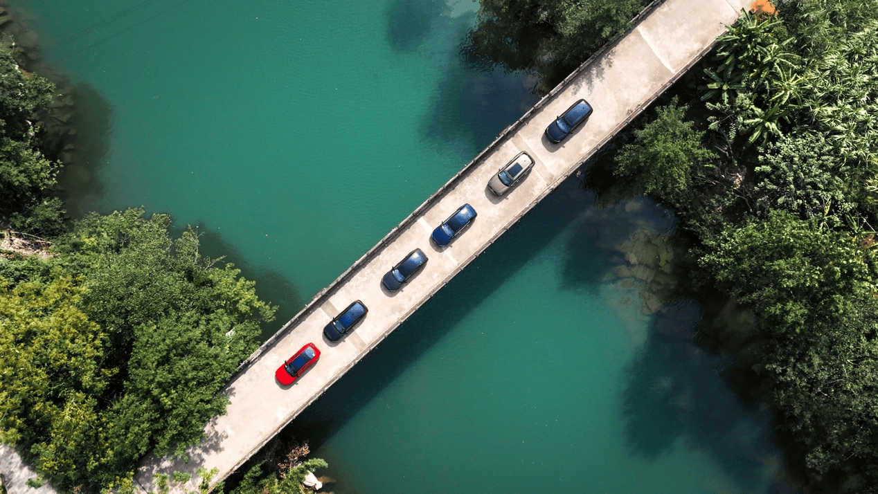 真正的驾驶,在离开预设场地后。车队沿着边境公路行驶,左手边是望不到头的甘蔗田,右手边铁丝网之外,就是越南的丛林。路况是“随机播放”的:一段崭新的柏油路可能突然终结,接上一段补丁摞补丁的水泥板;刚适应了县道的起伏,眼前毫无征兆地撒开一片碎石子。