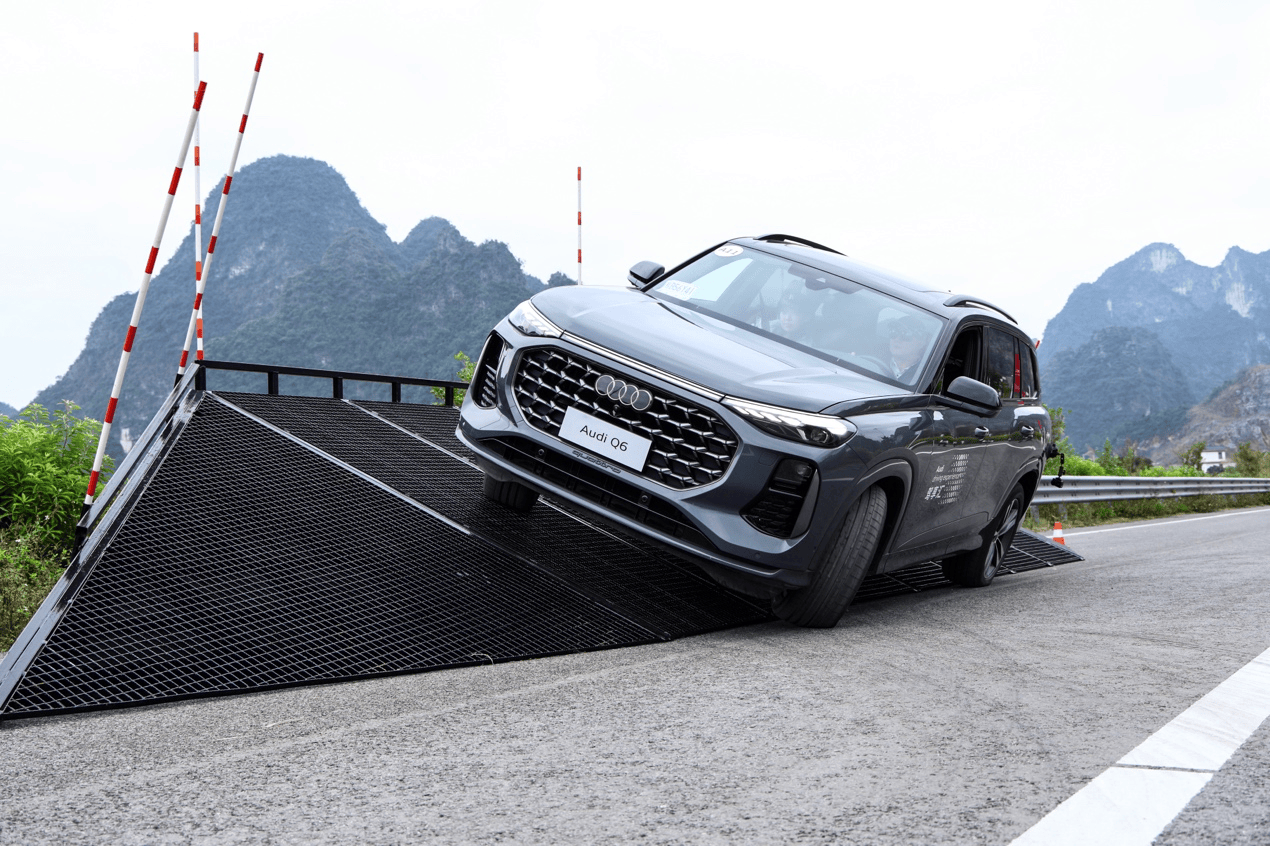 之后是Q6。看上去最憨,却最适合烂路。交叉轴路段里,车轮空转的瞬间,quattro 四驱系统已经不动声色地把动力转移到有抓地力的轮子上。