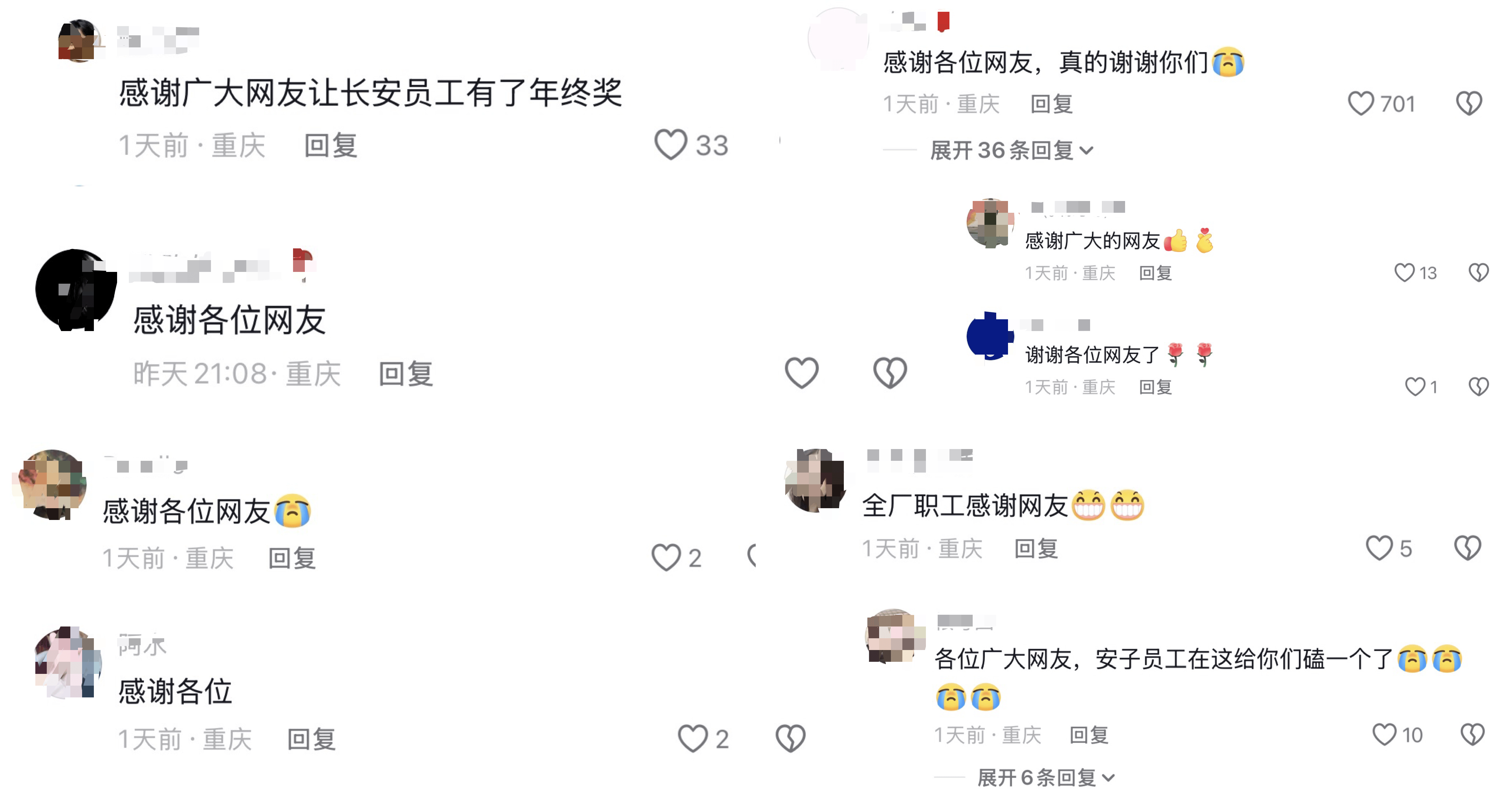 值得深思的是,清一色来自重庆的网友评论:感谢广大网友让长安员工有了年终奖。