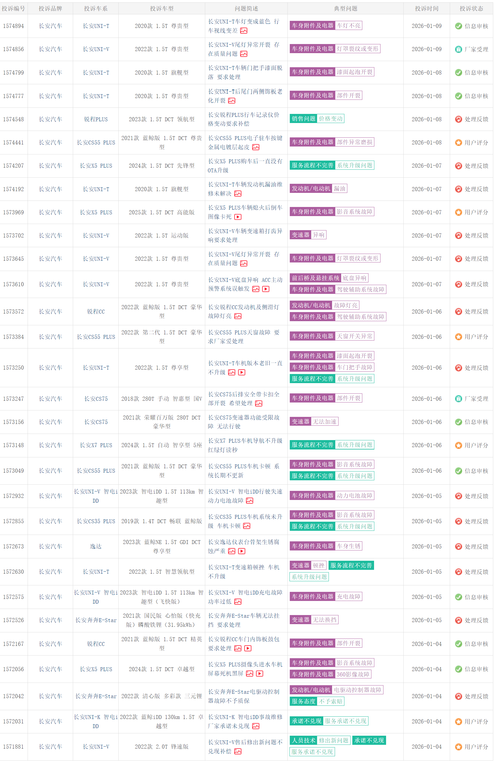 打开国内某知名投诉平台可以看到,进入2026年还不到10天时间,长安品牌就收到了数十起投诉。其中,长安UNI-V存在尾灯开裂、变速箱异响、底盘异响、门把手故障、电瓶故障等质量问题;长安UNI-T也有漆面脱落、部件老化开裂、发动机漏油、变速箱顿挫、车机卡顿等投诉。