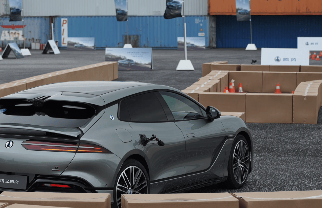 为了验证新Z9GT的灵活性,腾势在试驾场地用纸箱布置了狭窄的路线。作为5180mm车长、3125mm轴距的中大型猎装车,我在结合环车影像的情况下,可以用蟹行姿态通过看似不可能的拐角,而面对大幅掉头时,新Z9GT又能极为紧凑地扭过身体,加上易三方的圆规掉头功能,可以说选择腾势新车,新手司机也完全没有心理负担。