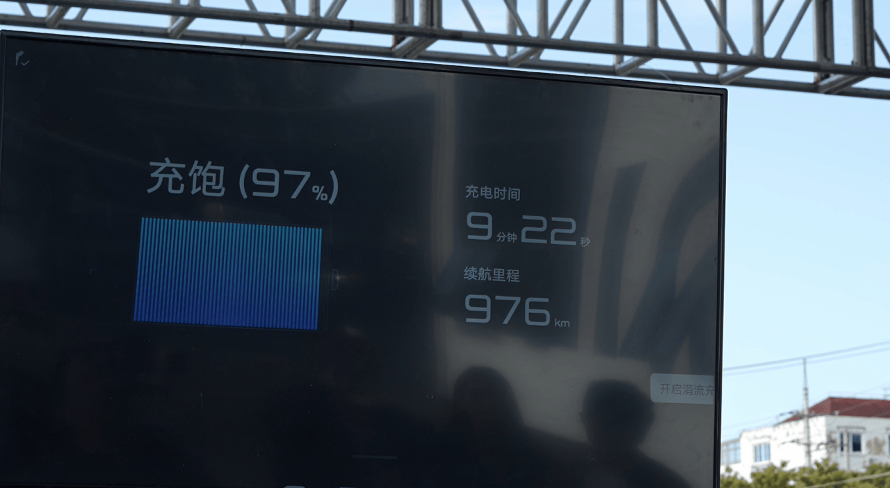 随后我在闪充站观摩了26款Z9GT的充电情况,展车用了9分22秒完成了10-97%的补能,确实符合官方宣传的“9分钟充饱”。不过从桩端到车内,我都没看到实时显示充电功率,不知道在26款Z9GT上究竟能跑出怎样的充电峰值。另外在测试中,闪充站仅为这一台车进行充电,如果同时三四台车在补能的话,功率分流后即使不能达到9分钟的数据,但也会远高于普通快充。