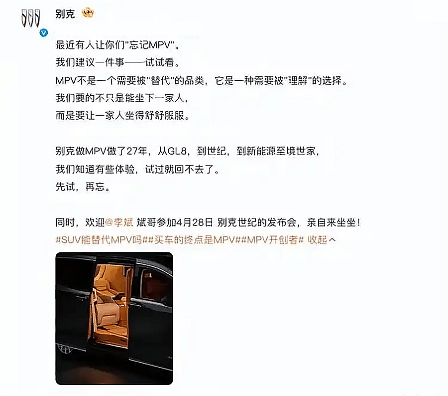 在蔚来ES9的发布会上,李斌的一句话再次带来很大的争议。在MPV细分市场里领军二十年的别克汽车显然不认同蔚来李斌的观点,称:“MPV不是一个需要被‘替代’的品类,它是一种需要被‘理解’的选择。”同时邀请李斌出席别克世纪MPV的发布会。